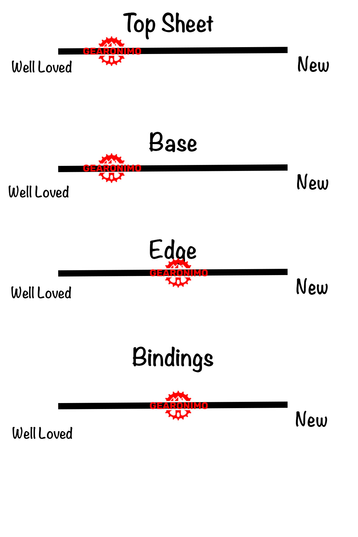 Condition: 1.5/5 - These skis have quite a bit of wear on the topsheet with some large gouges and have what looks to be a repaired coreshot on each ski. (See pictures for details) They have been repaired and are fully functional and ready to rip!