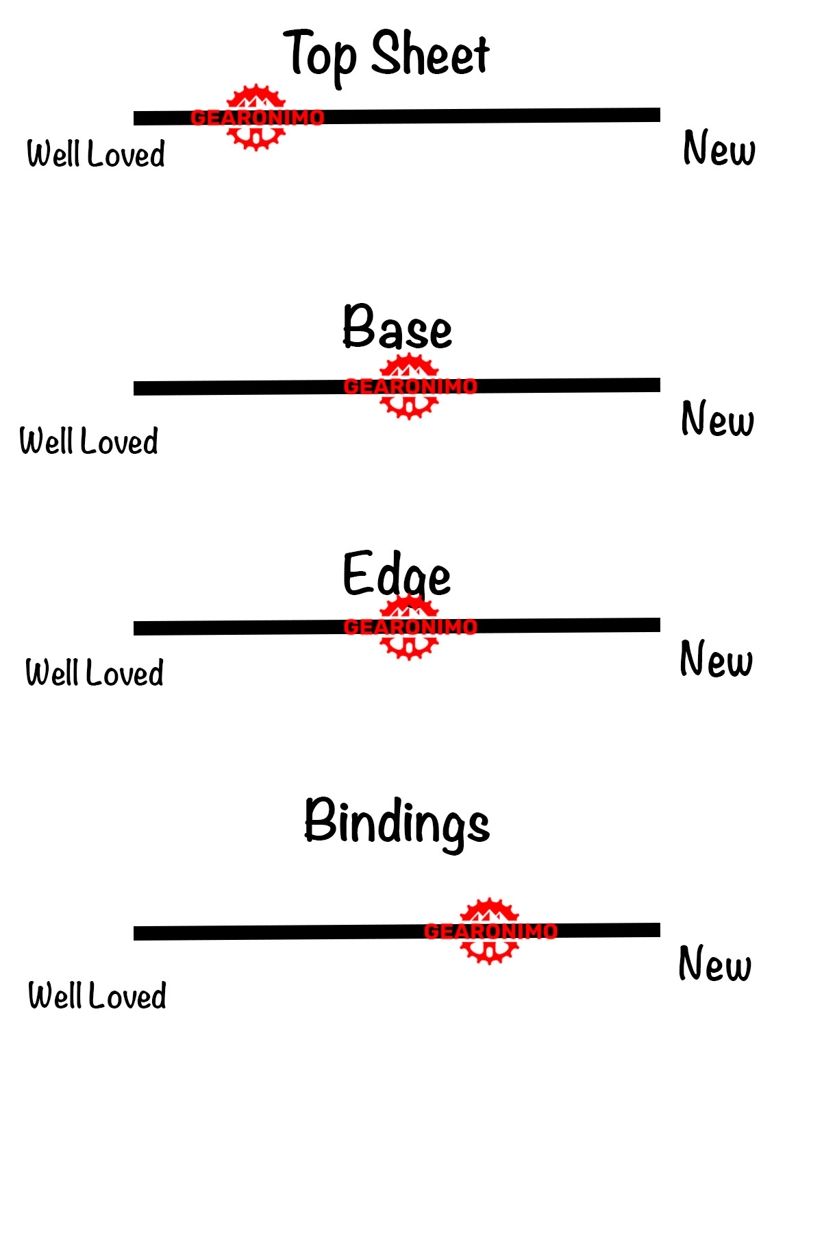 Condition = 2.5/5 These skis have seen some light to moderate use, showing typical topsheet damage and base scuffs. (See pictures for details)