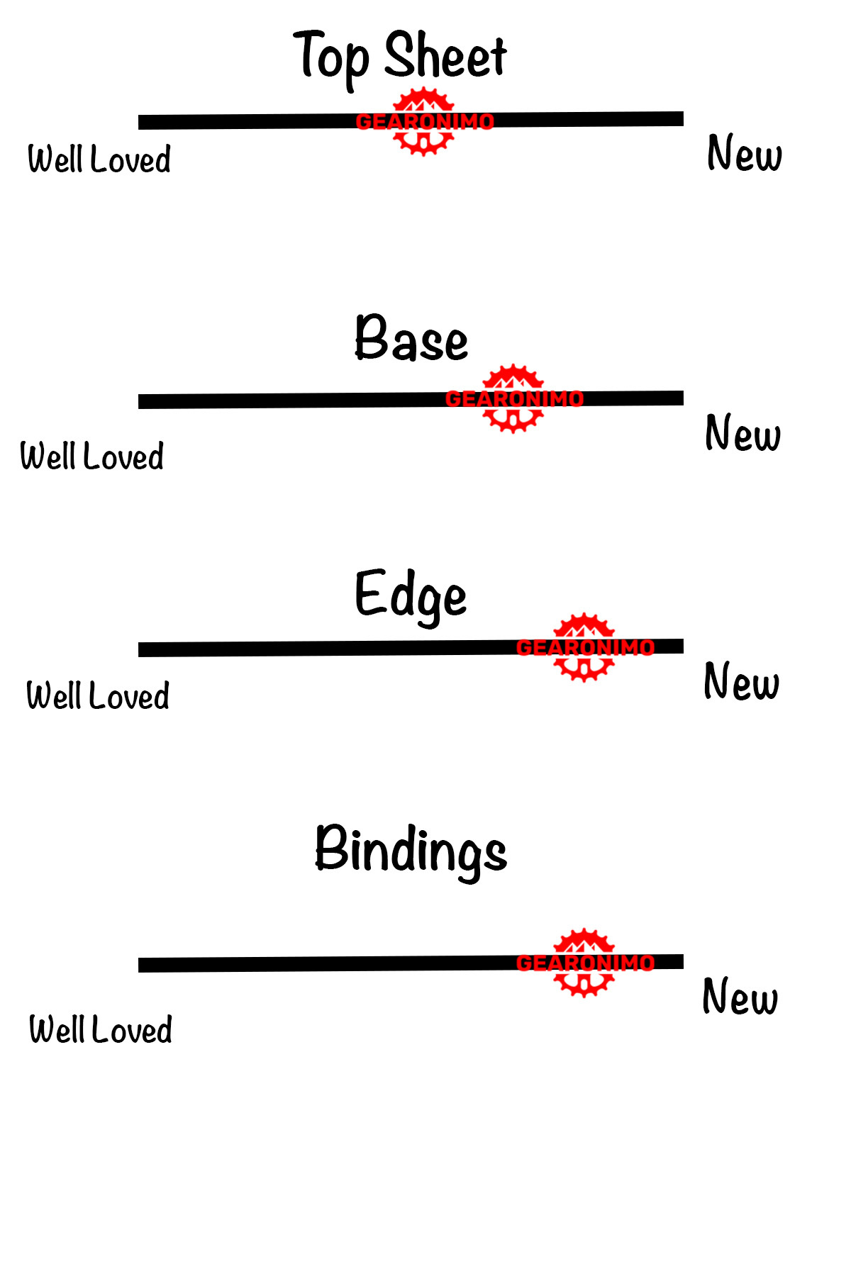 Condition = 3/5 these skis have moderate-heavy top sheet damage that has been repaired, but the bottoms look all good to go.