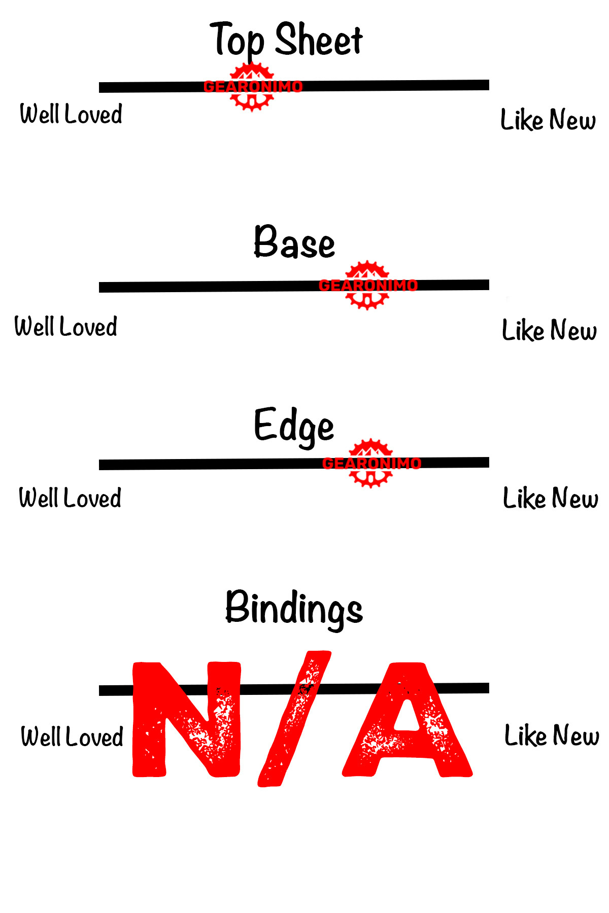 This snowboard shows moderate signs of use. There is some normal cosmetic wear from being used, including scratches, scuffs, and sun fading. There is still a lot of life left in the board, and it's ready to hit the snow.