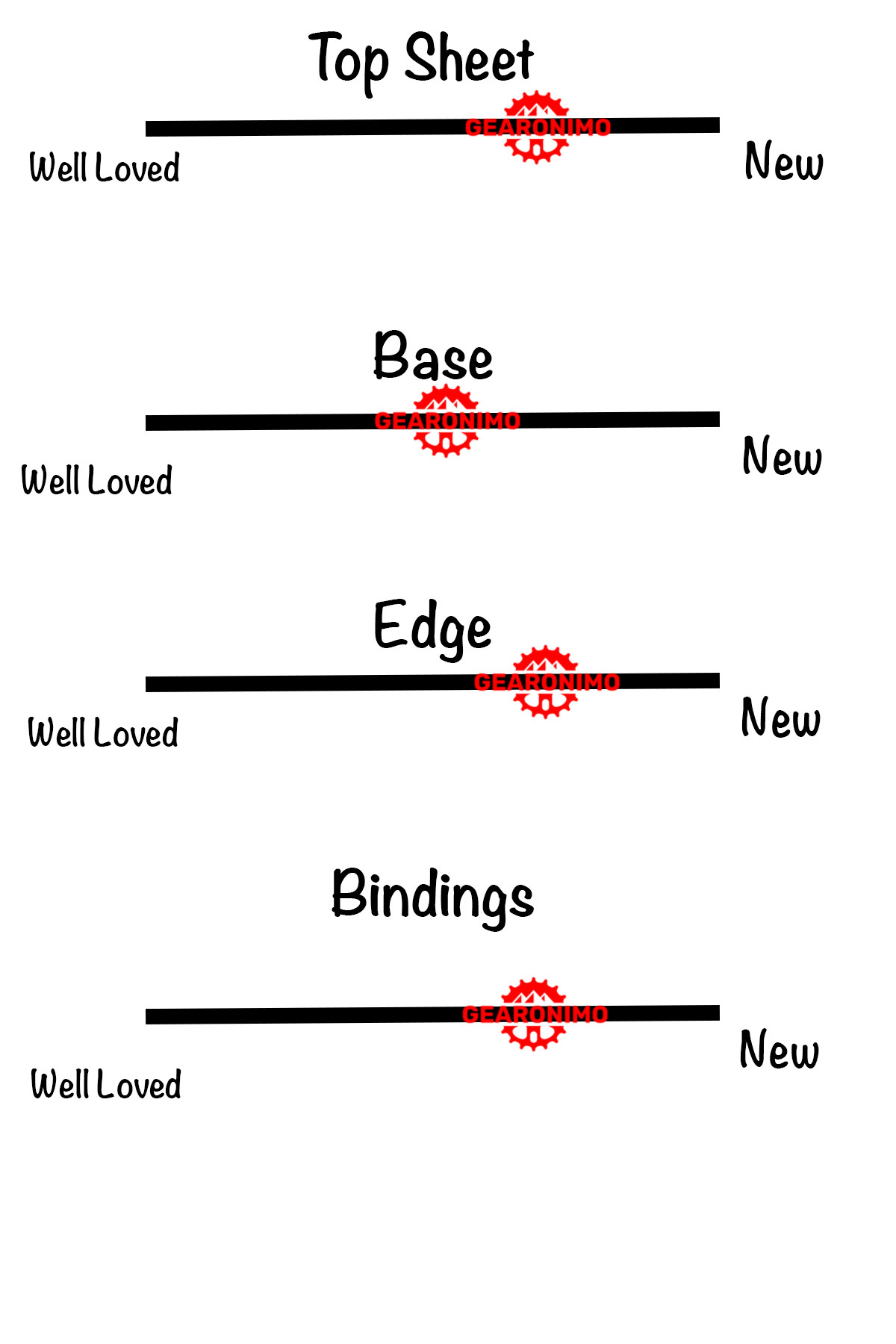 2/5 - These skis are in good shape but have a 2 small repairs on the bace and one small chip on the topsheet. Other then that they are ready for some more snow! *all skis with repaired core shots immediately get 2/5, even if the rest of the ski looks new.*