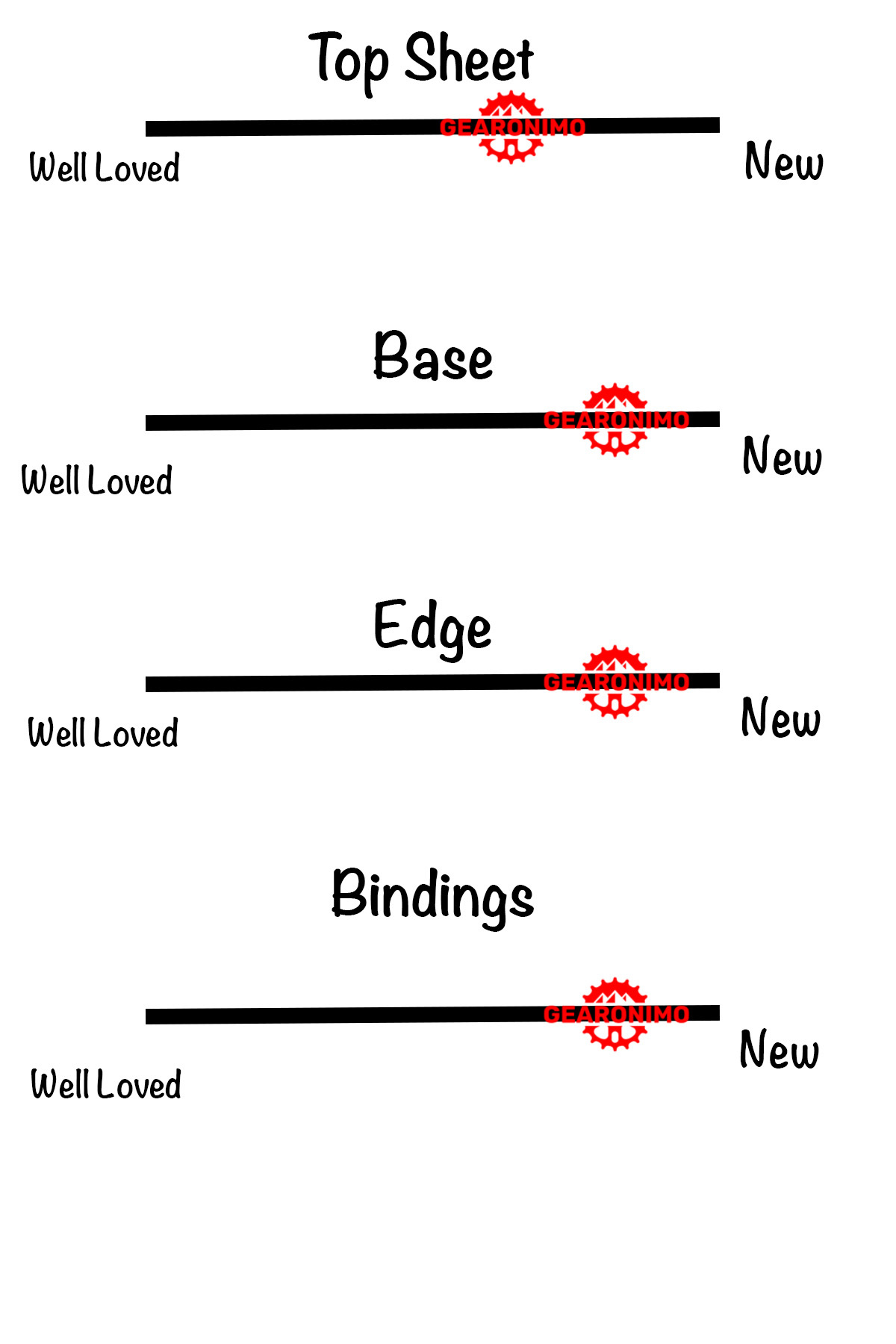 The top sheets show normal wear and tear with a few deeper scratches along the edges. The bases are in good shape with only light surface scratching. Overall, these skis have plenty of life left and are ready for many more days of fresh turns.