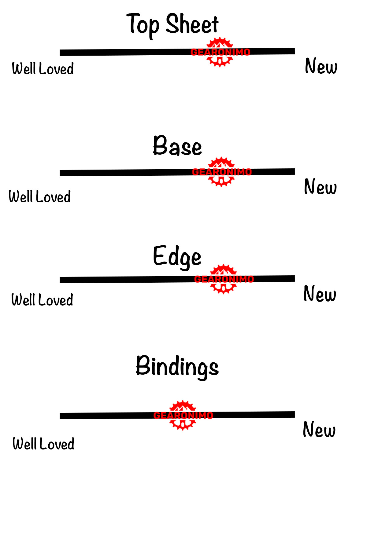 These skis are in good condition with moderate top-sheet scratching, but the bottoms look great and ready for some more snow.