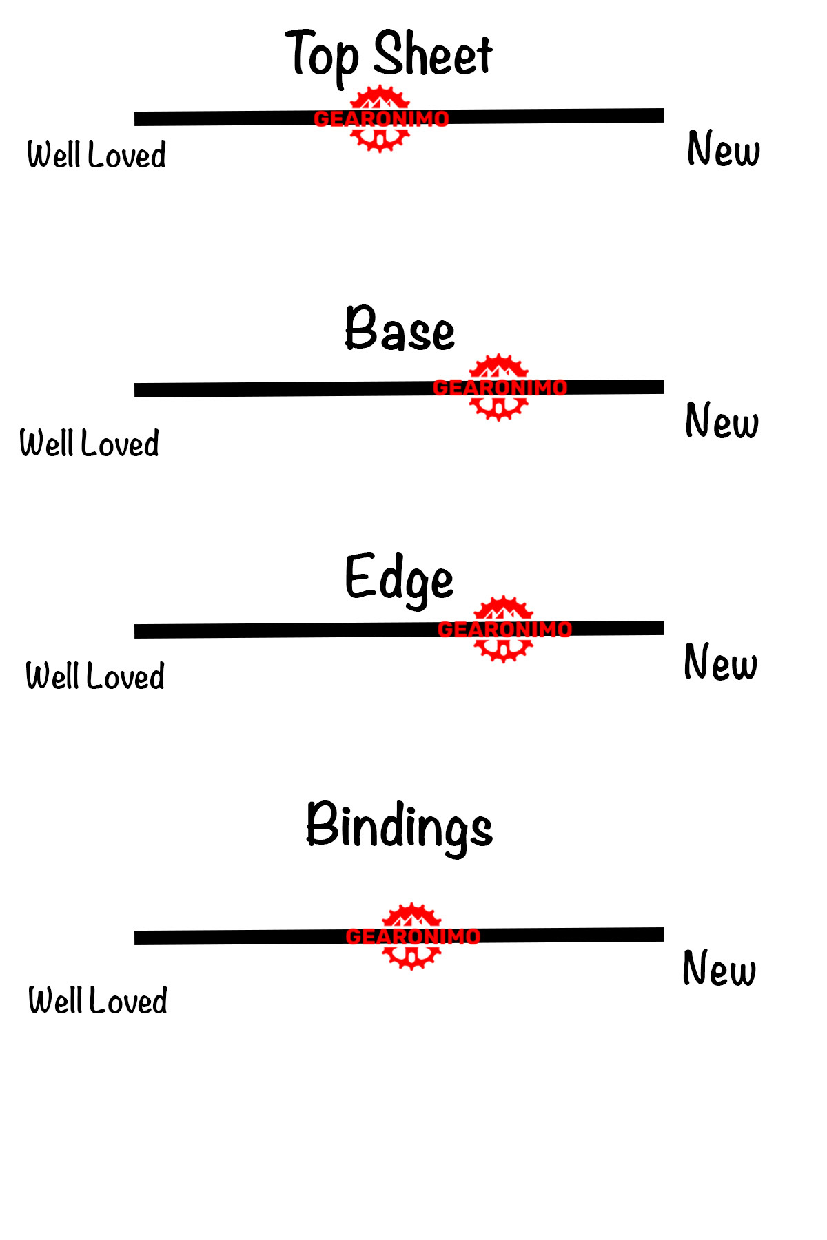 These skis were part of a rental fleet and show signs of rental wear and tear. Some of these skis have professional repairs that have been done on the bases. All skis are in shredable condition.