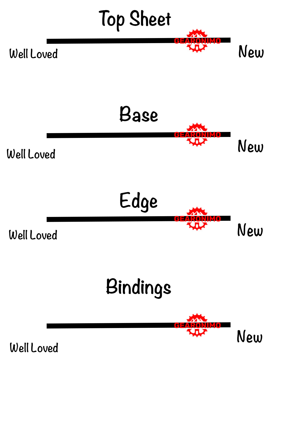 4.5/5 - These skis are in great condition with mainly just storage scratches. These bindings are currently mounted for a boot with a sole lenght of ~275mm.