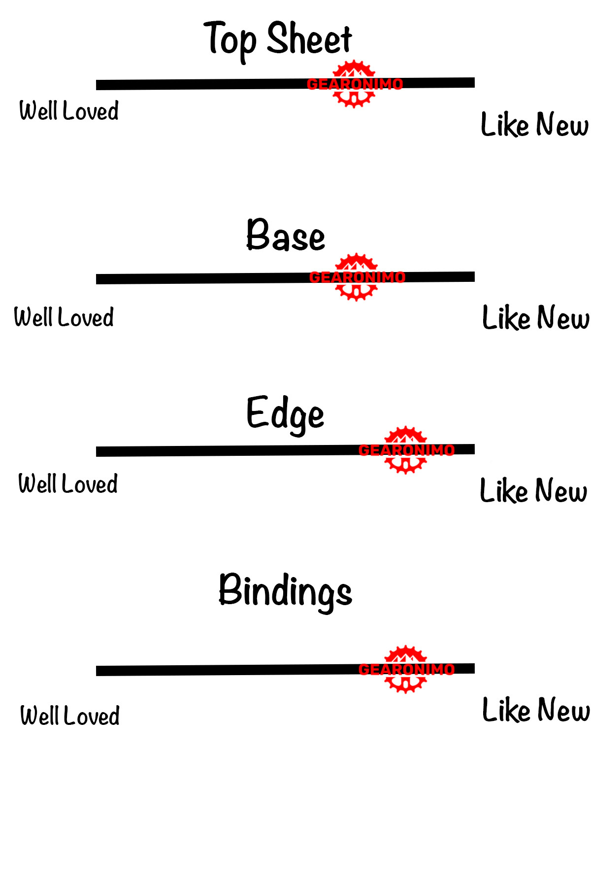 The top sheets have some repaired damage, while the base has light surface scratching, and a few small pitex repairs. Over all these skis are in good condition and ready to hit the slopes tomorrow.