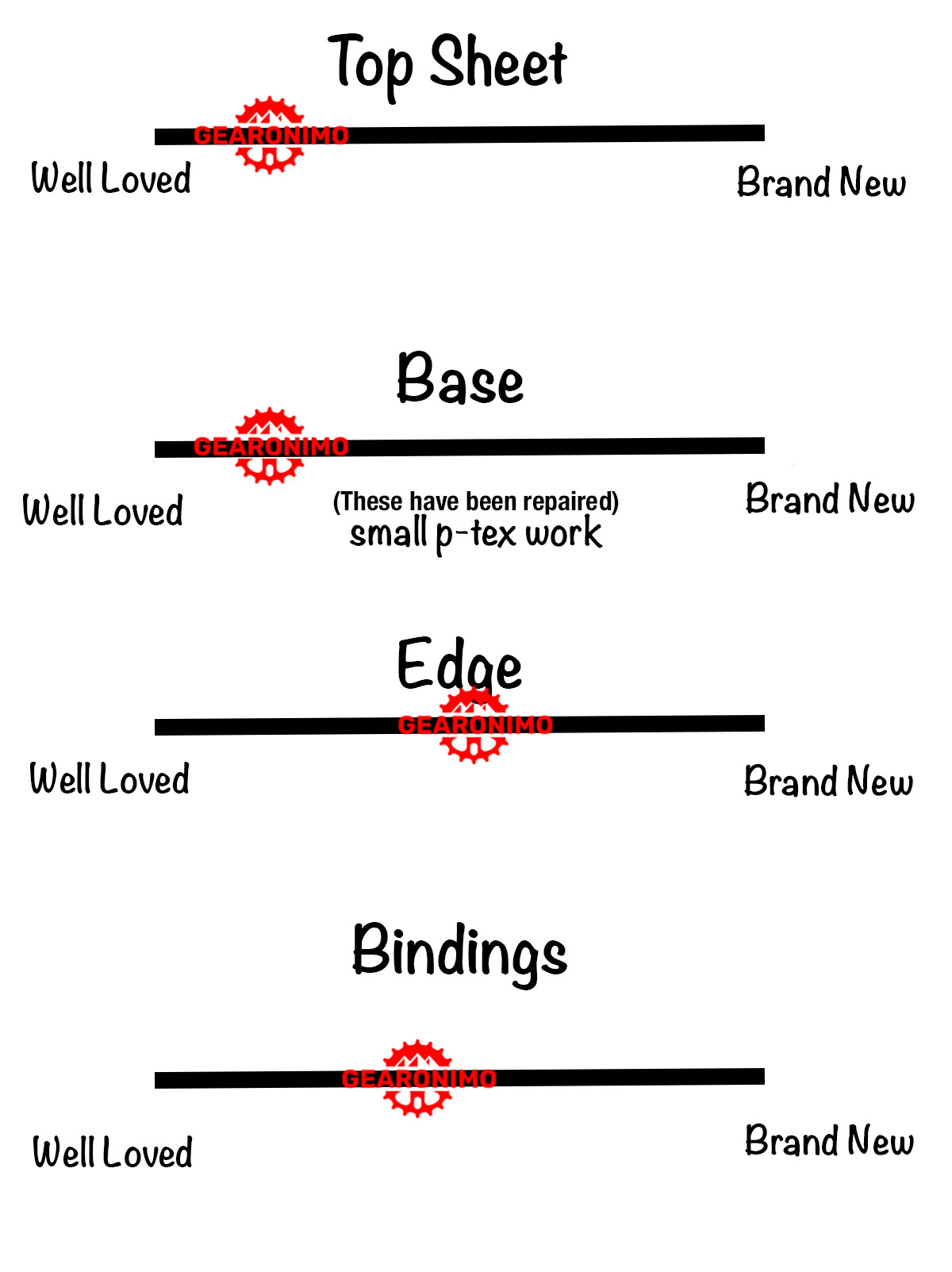 These skis have seen a fair bit of use. The topsheet is pretty scratched with some larger chips (see photos), but it is only cosmetic damage. The edges are in good shape, while the base shows a fair bit of ptex work, as well as a possible repaired core shot (see photos). Despite the seemingly low rating These skis have been loved, but are ready for some more days shredding some snow!