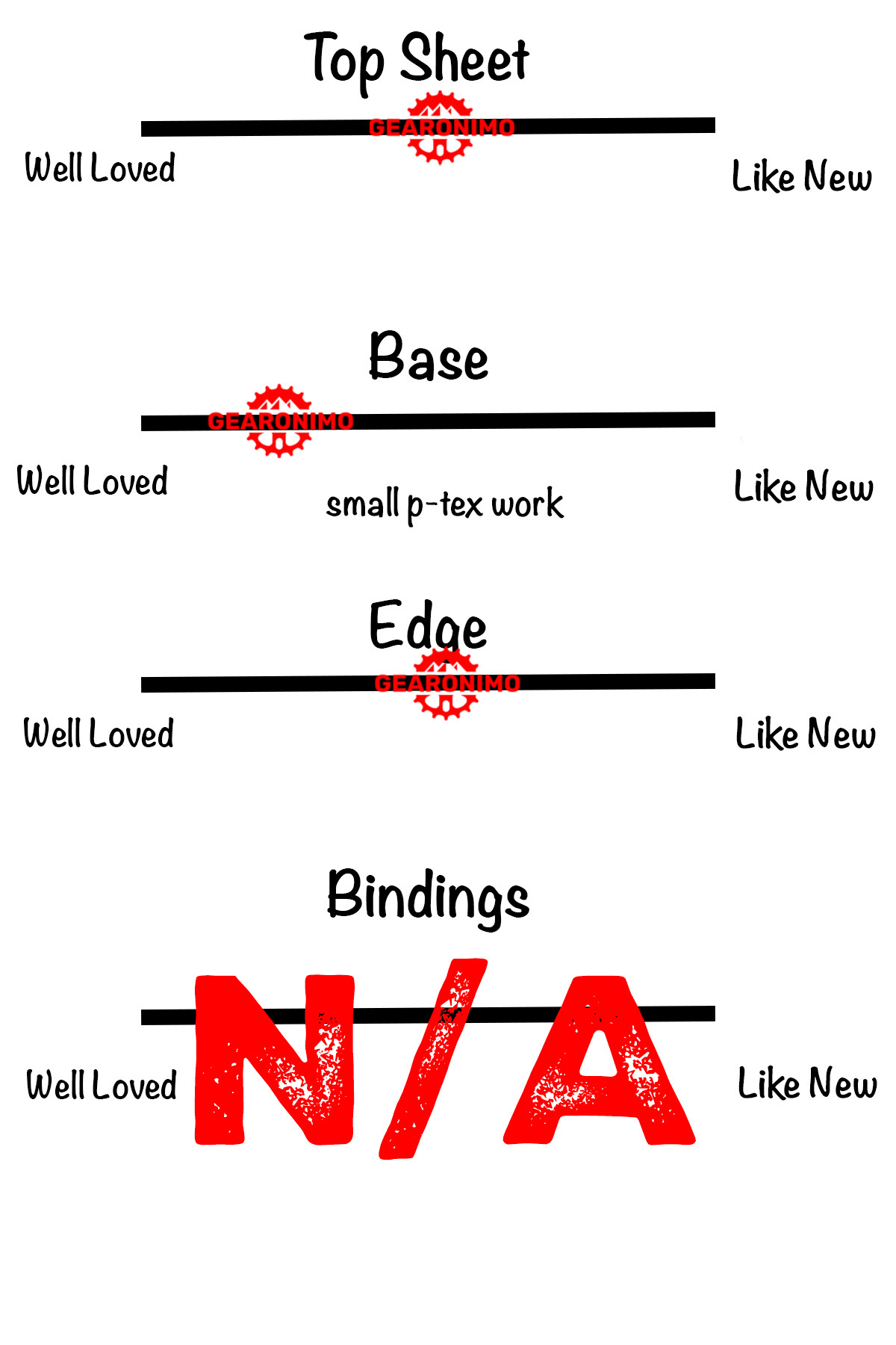 This board has seen some use with surface scratches on the base and the topsheet along with some p-tex repairs. The edges are in pretty good shape with some small dings from regular use. It is ready for some days out there shredding!