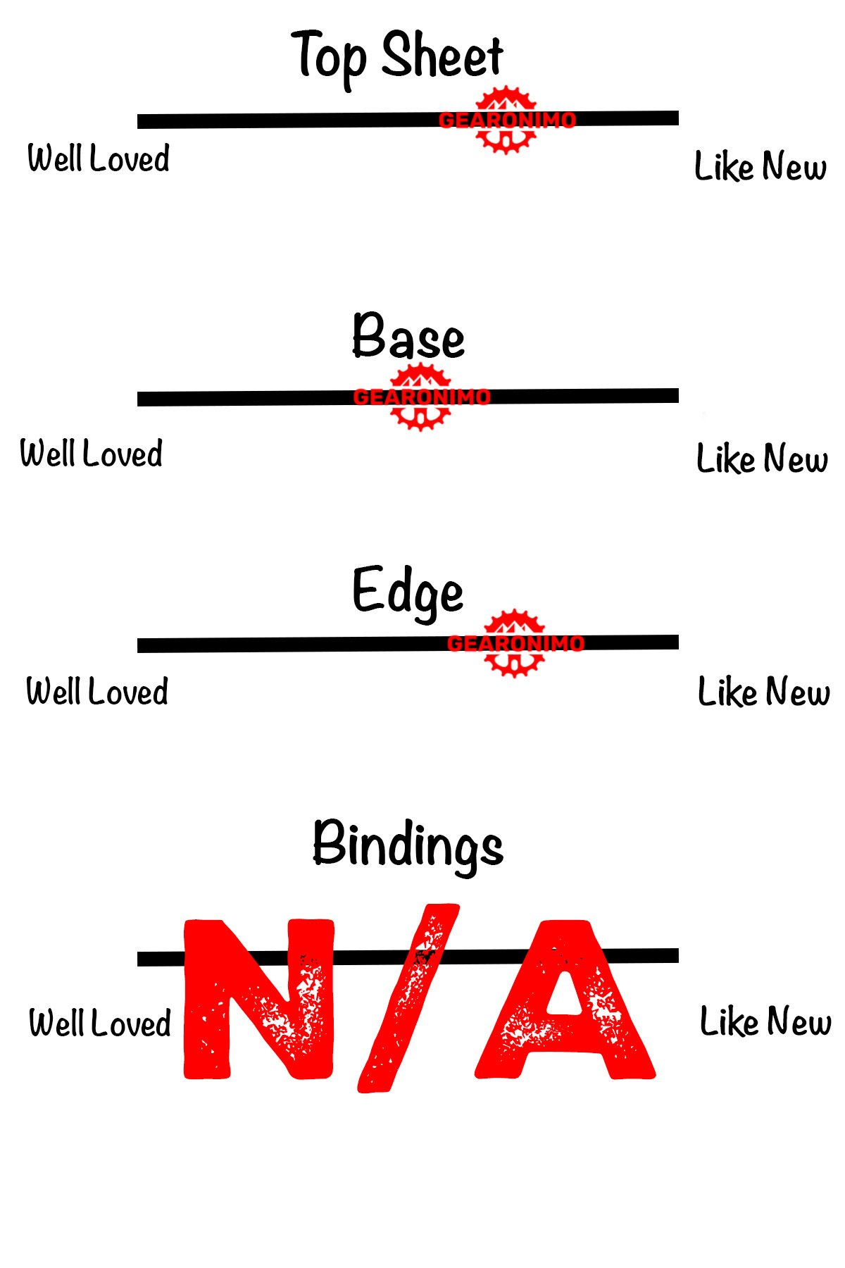 This board is in great shape! The top sheet shows regular wear and the edges are in very good condition. There are some very small scratches on the base near the edge from normal use, but they are not anything to worry about. Overall, this board is inn great shape and ready to hit the slopes!