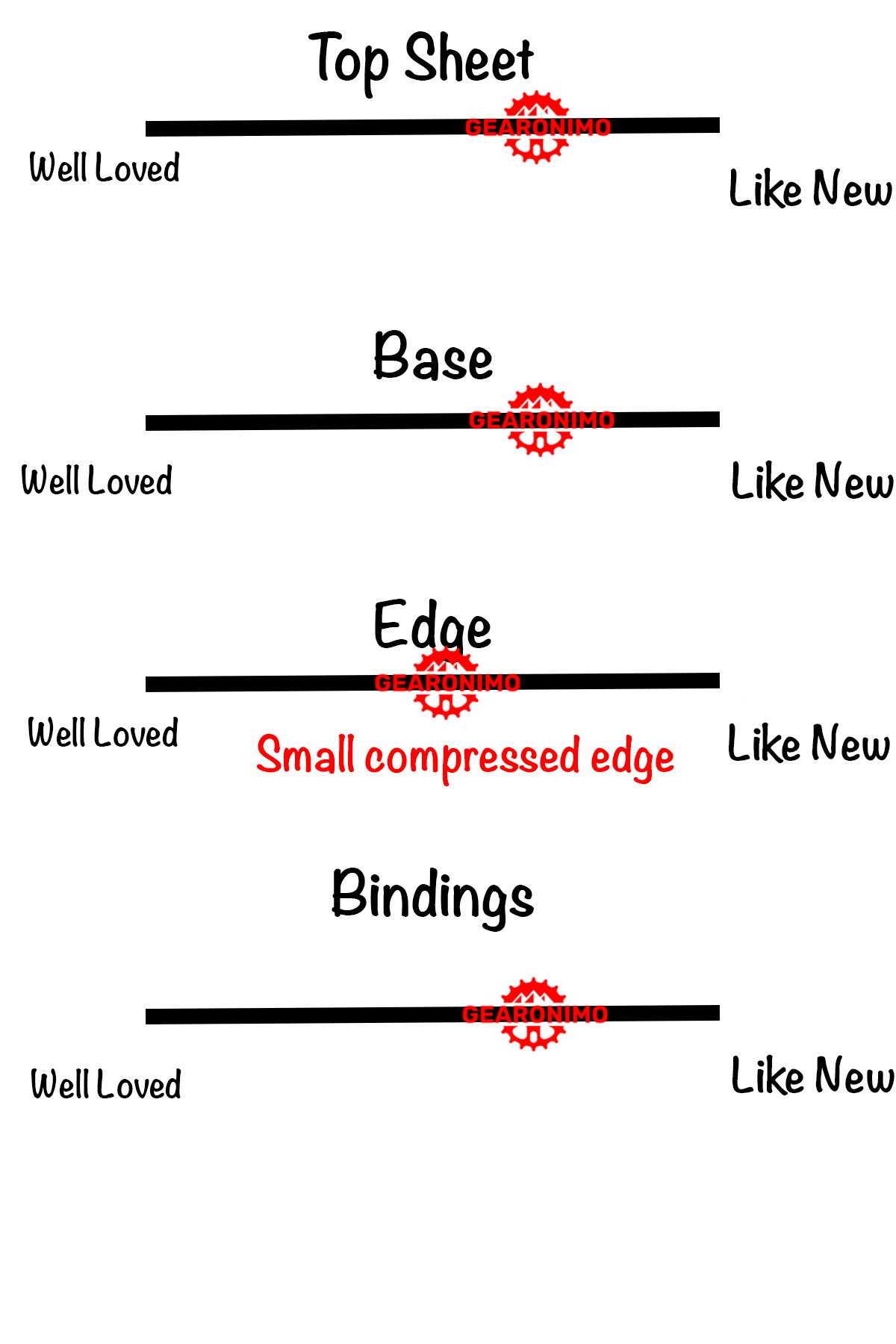 The top sheets show some previously repaired damage. The bases have light surface scratching along with a few small P-tex repairs. One ski has two very small edge compressions that do not affect performance. Overall, these skis are in good condition and ready to hit the slopes.