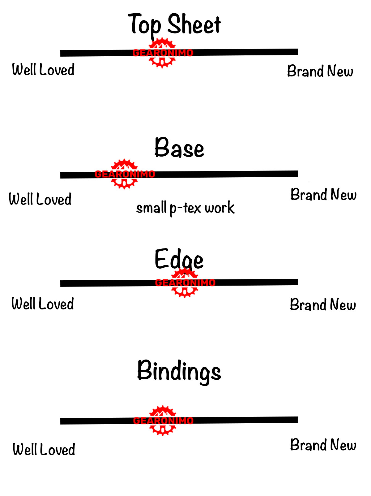 The topsheet shows normal wear and tear from use, and the edges are in great shape. The bases are somewhat scratched up with some ptex repairs, and a couple deep groves. Overall They are ready to get back on some snow!